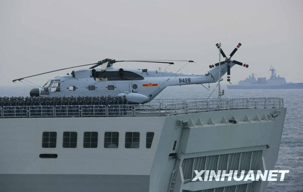 4月23日,中国海军“昆仑山”号登陆舰搭载着陆战队员和直升机接受检阅。新华社记者查春明摄