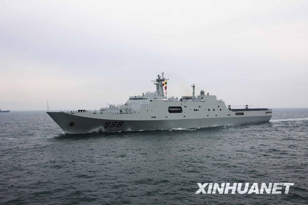 4月23日,中国海军“昆仑山”号登陆舰接受检阅。新华社记者查春明摄