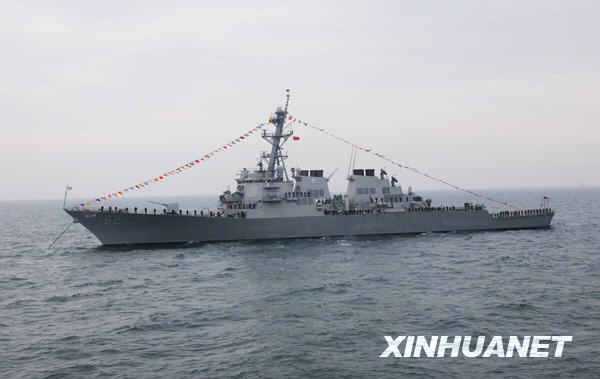 4月23日,美国海军“菲茨杰拉德”号导弹驱逐舰参加海上阅兵式。新华社记者查春明摄
