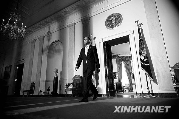 这是2月26日,奥巴马在白宫公布2010财政年度预算后离开记者会现场。
