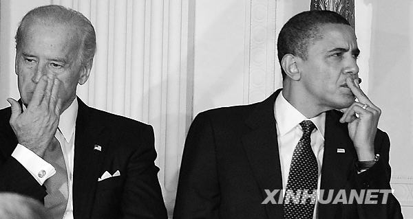 这是2月23日,美国总统奥巴马(右)和副总统拜登在白宫参加“财政责任峰会”。奥巴马表示在他的任期内美国财政预算赤字将会削减一半。(照片为彩色转黑白)新华社记者张岩摄