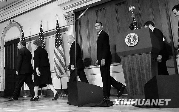 当日,奥巴马在2010年财政预算报告中为美国的预算赤字削减和未来医疗保健等项改革制订了蓝图。由左至右分别为,白宫国家经济委员会主席萨默斯、白宫经济顾问委员会主任罗默、副总统拜登、总统奥巴马、财长盖特纳和白宫行政管理和预算局局长欧尔萨格。这是奥巴马的核心经济团队。(照片为彩色转黑白)新华社记者张岩摄
