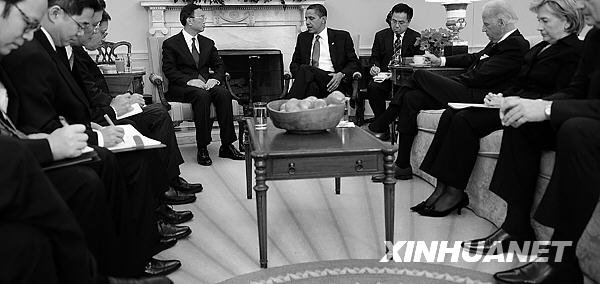 这是3月12日,奥巴马在华盛顿白宫会见正在美国访问的中国外交部长杨洁篪。(照片为彩色转黑白)新华社记者张岩摄