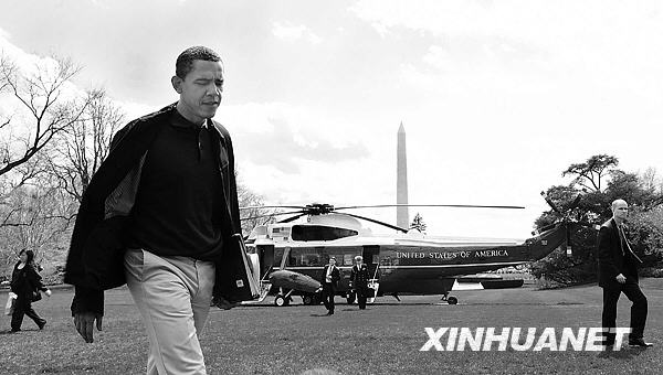 这是3月29日,奥巴马乘坐海军一号从戴维营返回白宫南草坪。(照片为彩色转黑白)新华社记者张岩摄