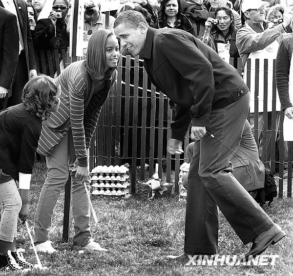 这是4月13日,在白宫南草坪举行的白宫复活节滚彩蛋比赛上,奥巴马帮助女儿萨莎(左一)及马莉娅(左二)参加比赛。(照片为彩色转黑白)新华社记者张岩摄
