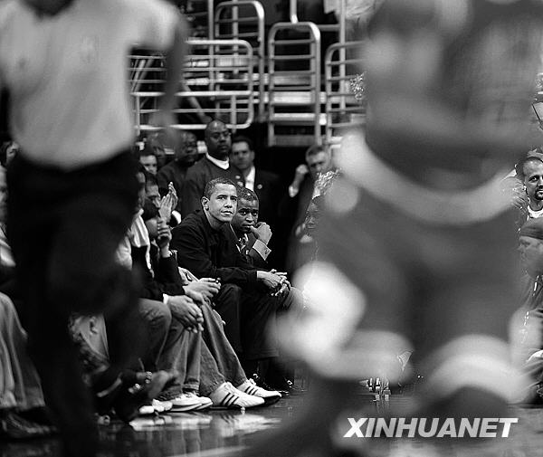 这是2月27日,奥巴马在华盛顿观看NBA常规赛华盛顿奇才队与芝加哥公牛队的比赛。(照片为彩色转黑白)新华社记者张岩摄