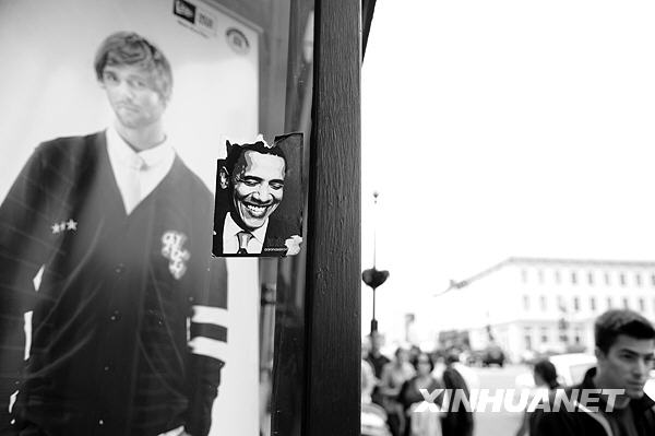 这是3月8日在华盛顿拍摄的贴有奥巴马头像的时装店橱窗。(照片为彩色转黑白)新华社记者张岩摄
