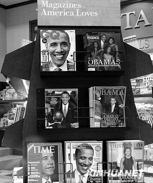 这是3月29日在华盛顿巴诺书店拍摄的杂志架,其中最受欢迎的杂志一栏全部被美国第一家庭为封面的杂志所占据。(照片为彩色转黑白)新华社记者张岩摄