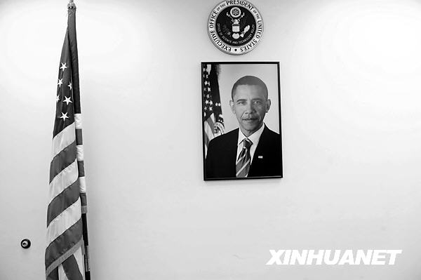 这是4月16日,在美国白宫行政楼白宫科技办公室拍摄的一幅奥巴马肖像照片。(照片为彩色转黑白)新华社记者张岩摄