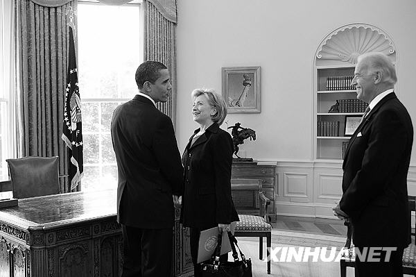 这是3月12日,奥巴马、副总统拜登及国务卿希拉里·克林顿在白宫总统椭圆形办公室中。希拉里和拜登都曾经是奥巴马的竞选对手。(照片为彩色转黑白)新华社记者张岩摄