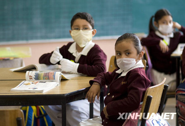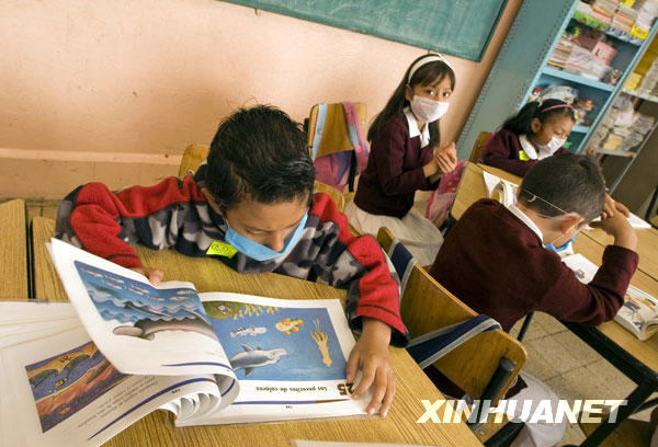 5月11日,墨西哥首都墨西哥城的一所小学的学生们在上课。当日,因受到甲型H1N1流感疫情影响的大多数墨西哥学龄前教育机构和中小学开始复课。新华社发(戴维 摄)