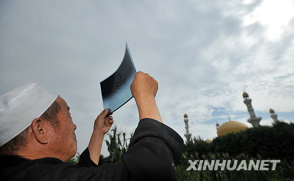 7月22日,在石家庄市石门公园,一位老人用X光片观看日食。新华社记者 王民 摄