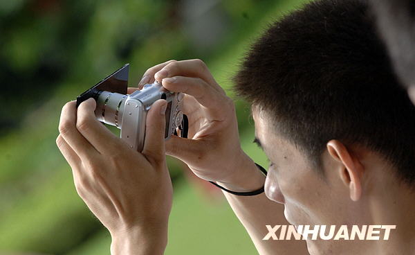 7月22日,三位中学生在济南体育中心用胶卷观看日食奇观。