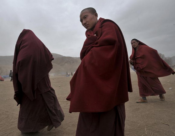 神色黯然的僧侣们急匆匆地奔赴为逝者超度的现场