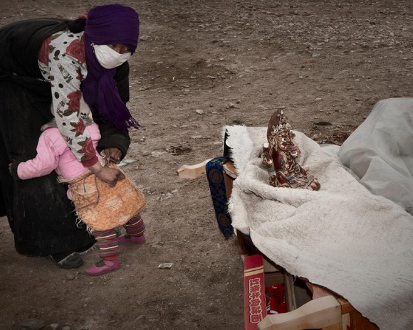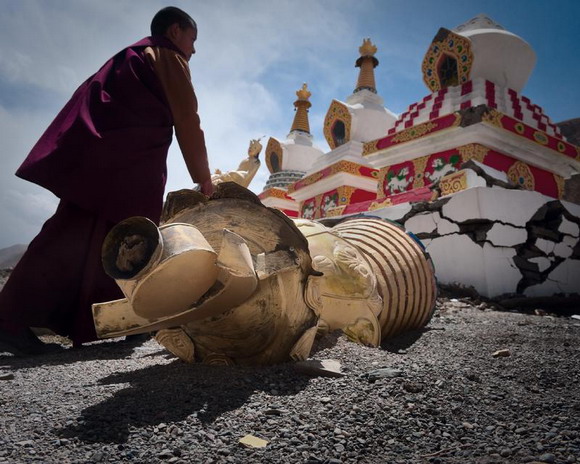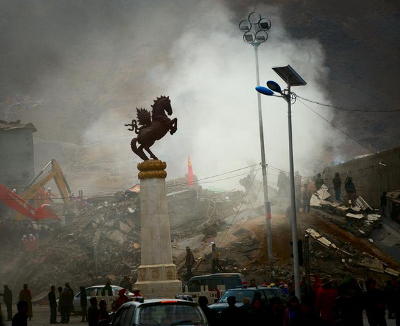 ??? 2010年4月14日,中国青海省玉树县发生里氏7.1级地震,两千多名同胞遇难。震后在这个以藏族同胞为主体居民的高原县城,随处可见幸存者在抢救佛器,他们裹着佛雕,抱着莲花,扶起倒下的神像。玉树的藏民并不认为死亡是与生者的诀别,在他们看来,那就像藏传佛教的转经筒一样旋转不停,在生命的六道轮回里,只是下一次生死轮回的起点。对生的信仰就像不倒的格萨尔王像,历经劫难却依然屹立在广场中央;与藏传佛教的佛塔同样挺拔的还有那面鲜艳的五星红旗,它寄托着这个国家与13亿同胞对玉树的希望。玉树对生的信仰感动着高原的天地,愿天佑玉树。