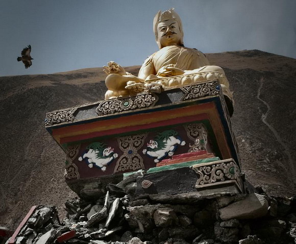 4月17日一只飞鸟飞过玉树禅古寺旁倾斜的神像上空