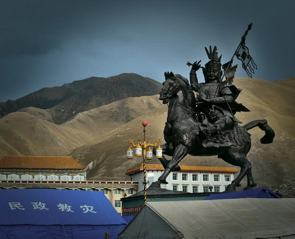 格萨尔王的雕塑下打起了防震棚