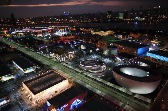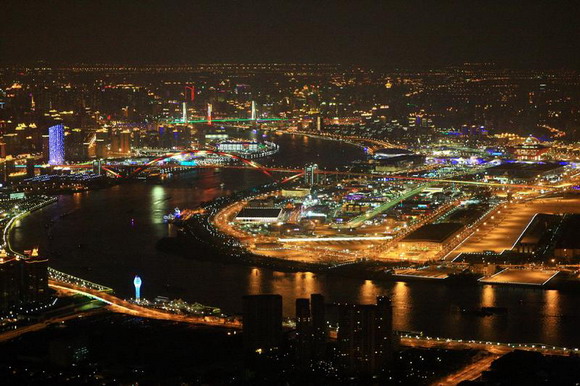 ????2010上海世博会期间,记者乘坐直升机从空中俯拍上海世博园,夜幕下的世博园美不胜收。