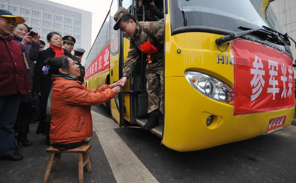 12月14日中午,湖南湘潭被提名为中国十大三农人物的 “板凳妈妈”许月华张罗了一桌子好菜,送别一身戎装的赖明智于当晚奔赴军营。他们开赴的地点是吉林某野战部队。当看到 “板凳妈妈”亲自送儿参军来到集结现场时。湘潭军分区领导和新战士鼓掌欢迎,向她表示崇高的敬意。