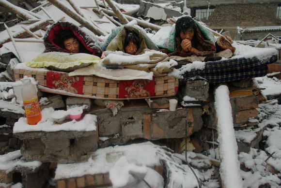 2010年4月22日,中国青海玉树地震灾区,三位兄弟在雪中露宿,守候着自家被埋在废墟里的财物。4月14日,青海玉树发生里氏7.1级地震,造成2000多人遇难。