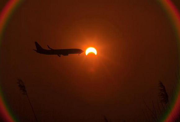 2010年1月15日,天津,一架民航客机从夕阳西下的天空中飞过。当天,千年一遇的日食景观在全国大范围城市上演,尽管在天津只能看到日偏食,但“千年最长日环食”的奇观仍吸引了众多市民。