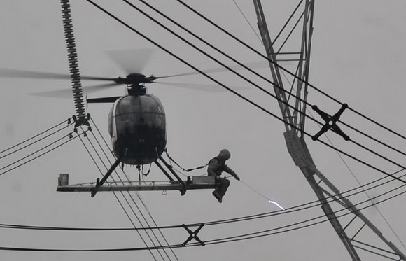 2010年4月12日下午2时许,武汉市蔡甸区柏林镇郊,在两座50万伏的超高压线路的铁塔间,一名线路维修工人乘坐在一驾直升机起落架的平台上,升于60米高空。工人随着直升机穿行高压线间,抓住没有停电的50万伏的高压线,完成一系列的带电作业。