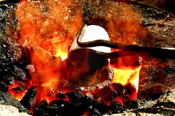 2010年8月17日, 山西省运城市。用焦炭烧到一定温度后,在金子里加入硼矾以提高金子纯度。