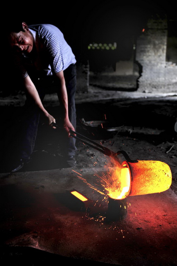 ??? 2010年8月17日, 山西省运城市。把熔化后的金水倒入模具时,一个冷模具发生了迸溅,金子滚落得到处都是。