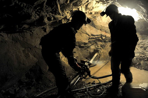 2010年7月22日, 山西省运城市。 1000米深的矿井下,两名打钻工正在钻孔准备安装炸药。