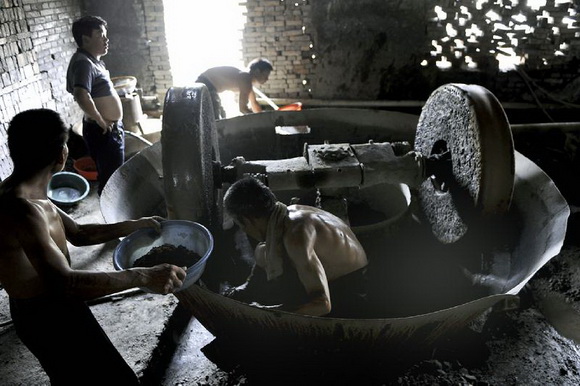 ??? 2010年7月24日, 山西省运城市 。在磨金子时,大老板、小老板和矿工等各方代表都要在场,每天磨出的“汞金”用电子称称好后,开出三联单票据。