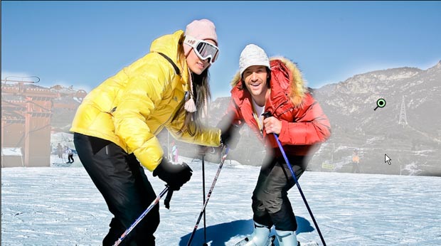 步骤2.在Camera Raw工具栏选择“调整画笔”工具,“新建”并重置参数。然后点选“显示蒙版”,对背景中山体、人物等进行去饱和的黑白处理。