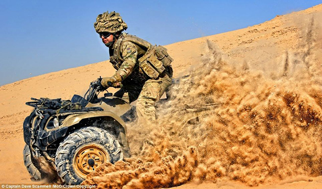 四轮车,摄影师:上尉Dave Scammell,该作品获得了Portfolio业余组的冠军。隶属于无人操控系统炮兵排的中士Evans正在阿富汗训练区进行四轮车驱动训练。