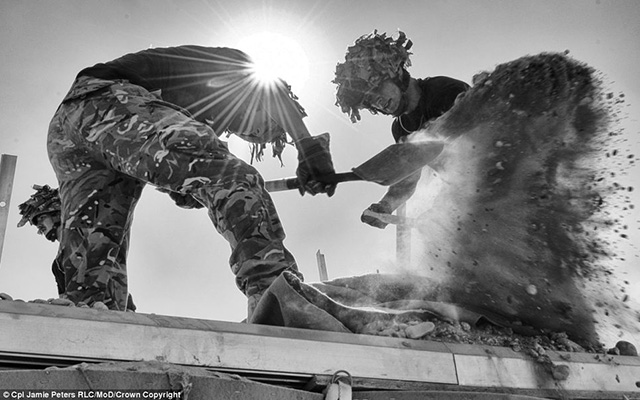阳光沙滩与士兵,摄影师:下士Jamie Peters RLC。烈日下,21工程师团的工兵们正在Nahidullah巡逻基地拆卸一幢名为Hesco堡垒建筑。