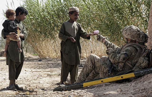 赠予朋友的花,摄影师:下士Jamie Peters RLC。巡逻结束后,威尔士卫队的一名卫兵正在村边休息,他们这次的行动任务是清除叛乱及维护村民安全。