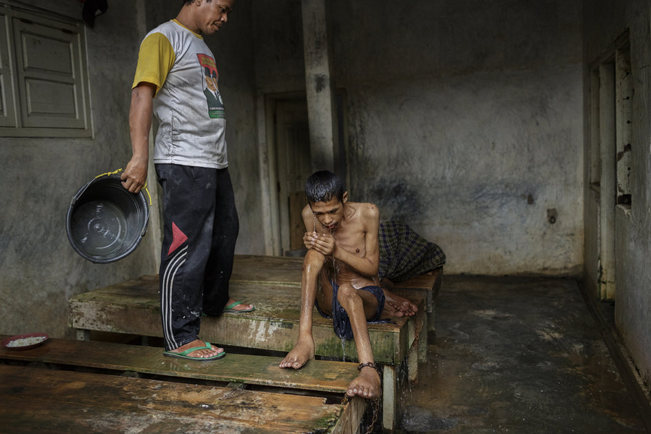 赛阿姆苏尔(Kyai Syamsul)自家运营的收容所中唯一的助理、主要的看护马斯托福(Mustofa)给25岁的阿卡罗姆(Akrom)洗澡。
