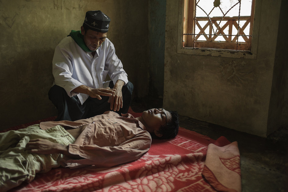 25岁穆斯托法(Mustofa)是Kyai Syamsul家庭避难所的唯一助手兼主要看护者,正在为安克荣(Akrom)洗澡。